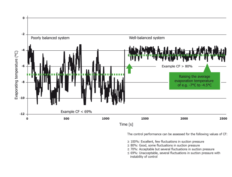 Thanks to a wide range of capacity modulation of the compound system, both the minimum load and varying cooling and heating loads up to the maximum load are optimally covered. Precise capacity control optimises dynamic system behaviour, improves control accuracy (CF) and lowers temperature differentials in heat exchangers, thus reducing fluctuations in pressure, which result in losses, and high cycling rates. Calculations demonstrate that precise control of compressor capacity can increase system efficiency considerably. Raising the evaporation temperature by 3 Kelvin can improve efficiency by up to twelve per cent, whilst reducing the condensing temperature by 1 Kelvin can improve efficiency by another two to three per cent.