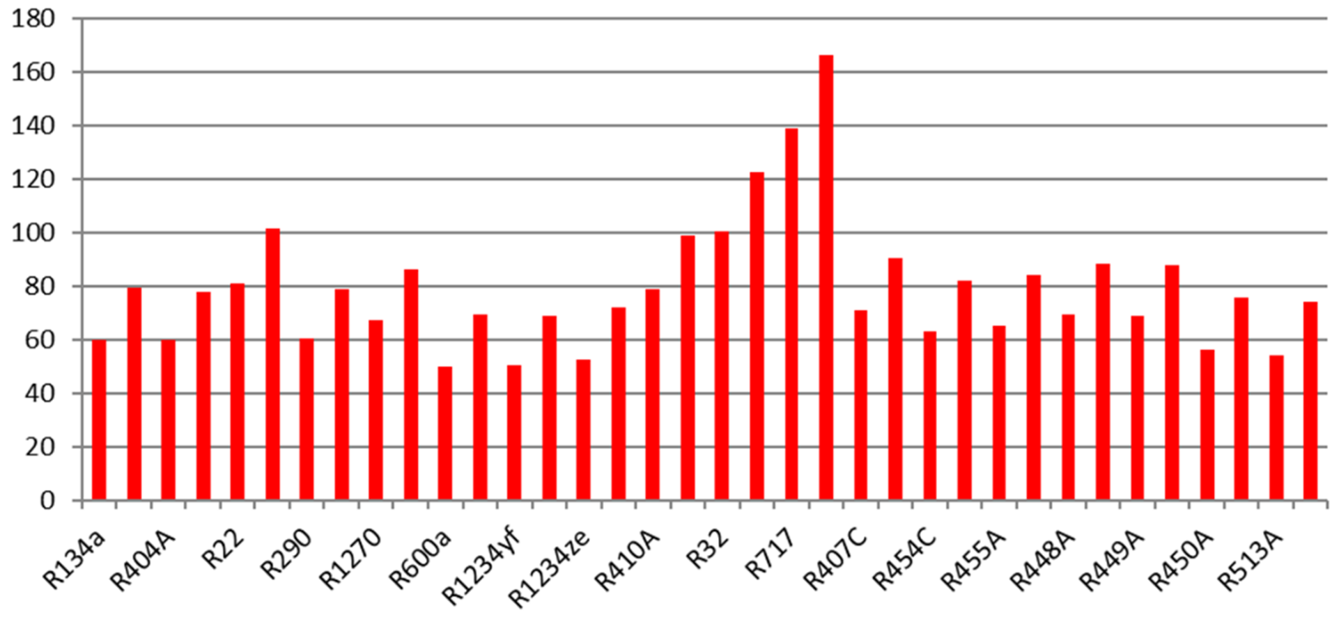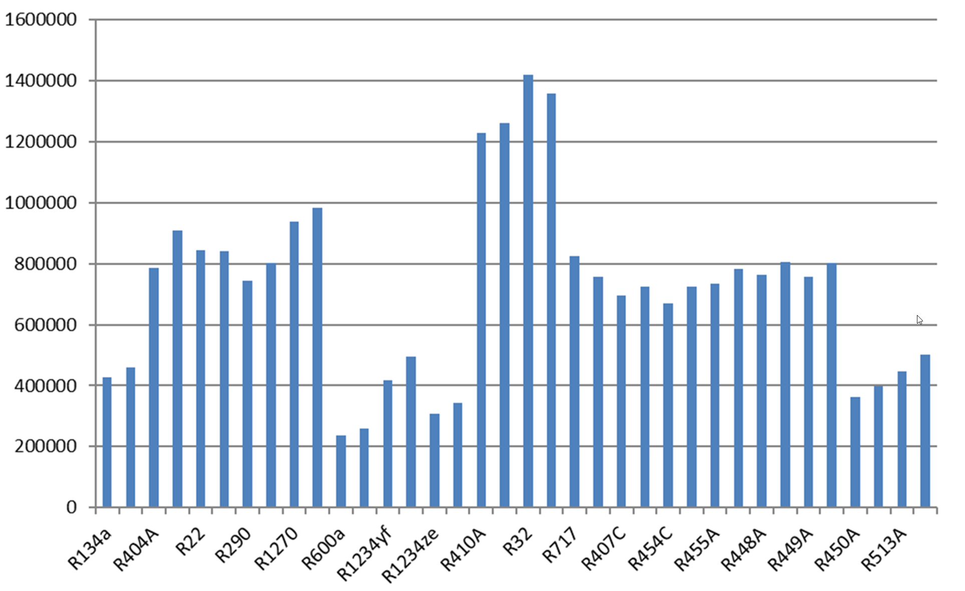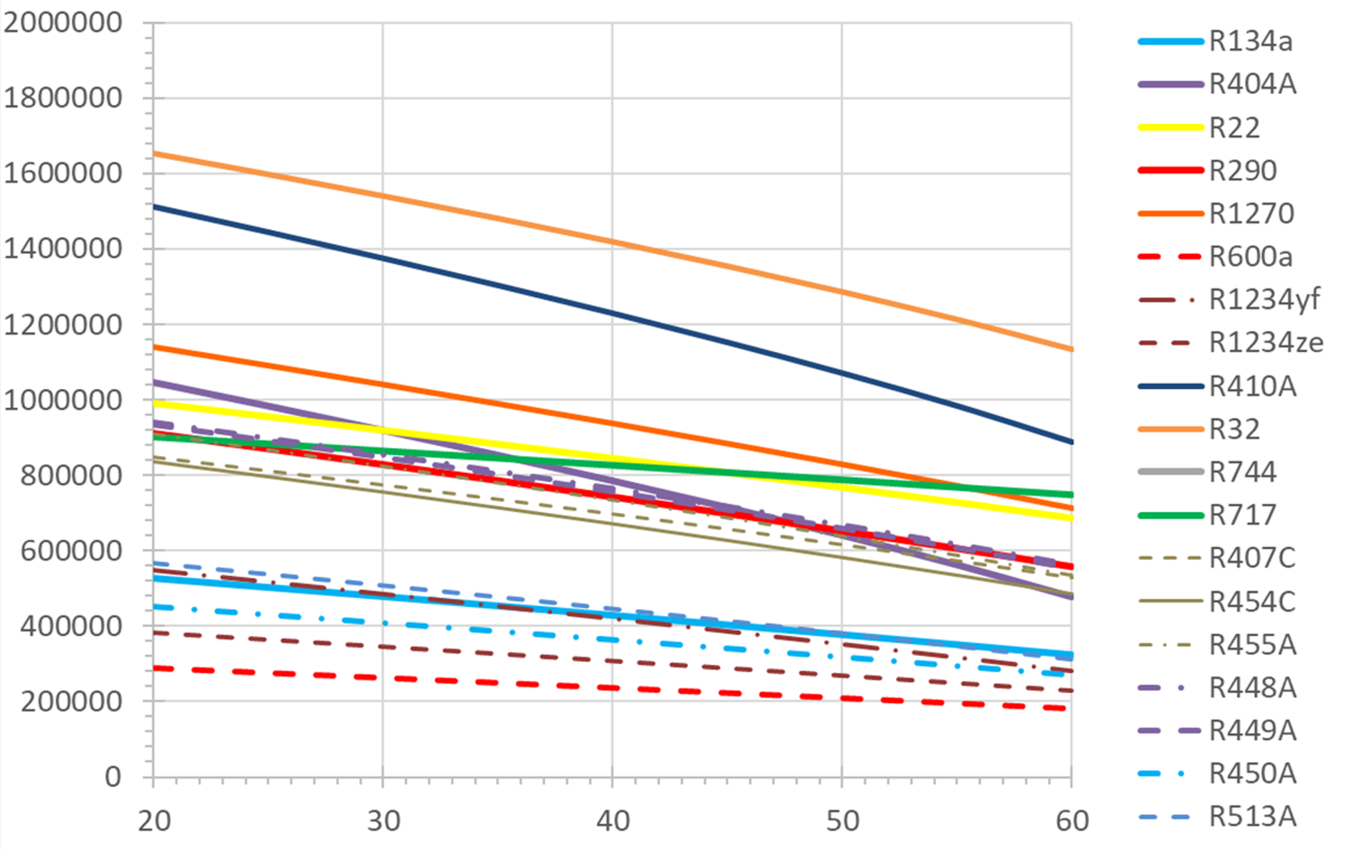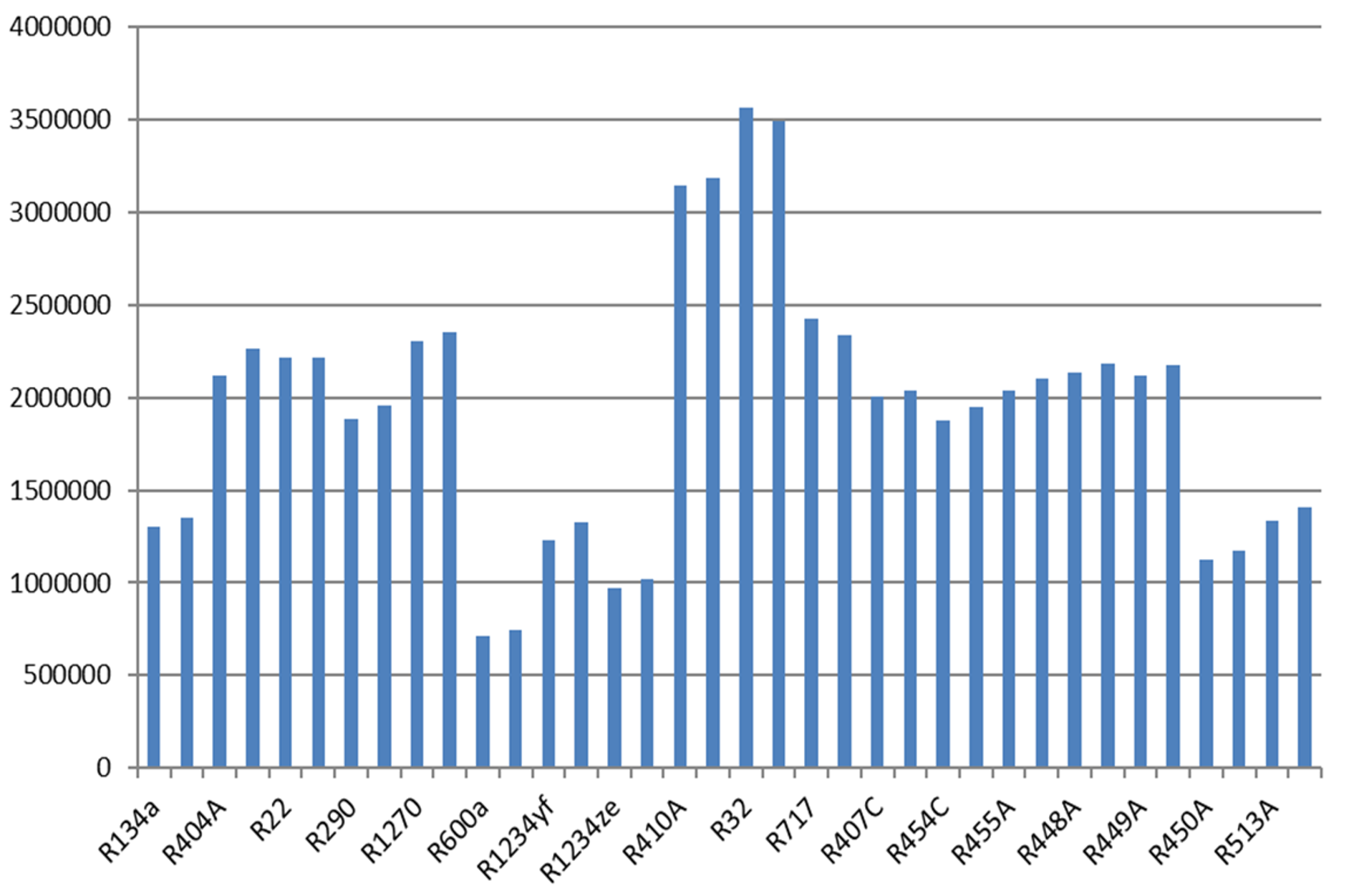 Die volumetrische Kälteleistung unterscheidet sich bei den Kältemitteln stark, von etwa 0,7·106 J/m3 bei R600a bis etwa 3,5·106 J/m3 bei R410A. Bei einer gegebenen Kälteleistung müsste also bei R600a das 5-fache Volumen gefördert werden wie bei R410A.