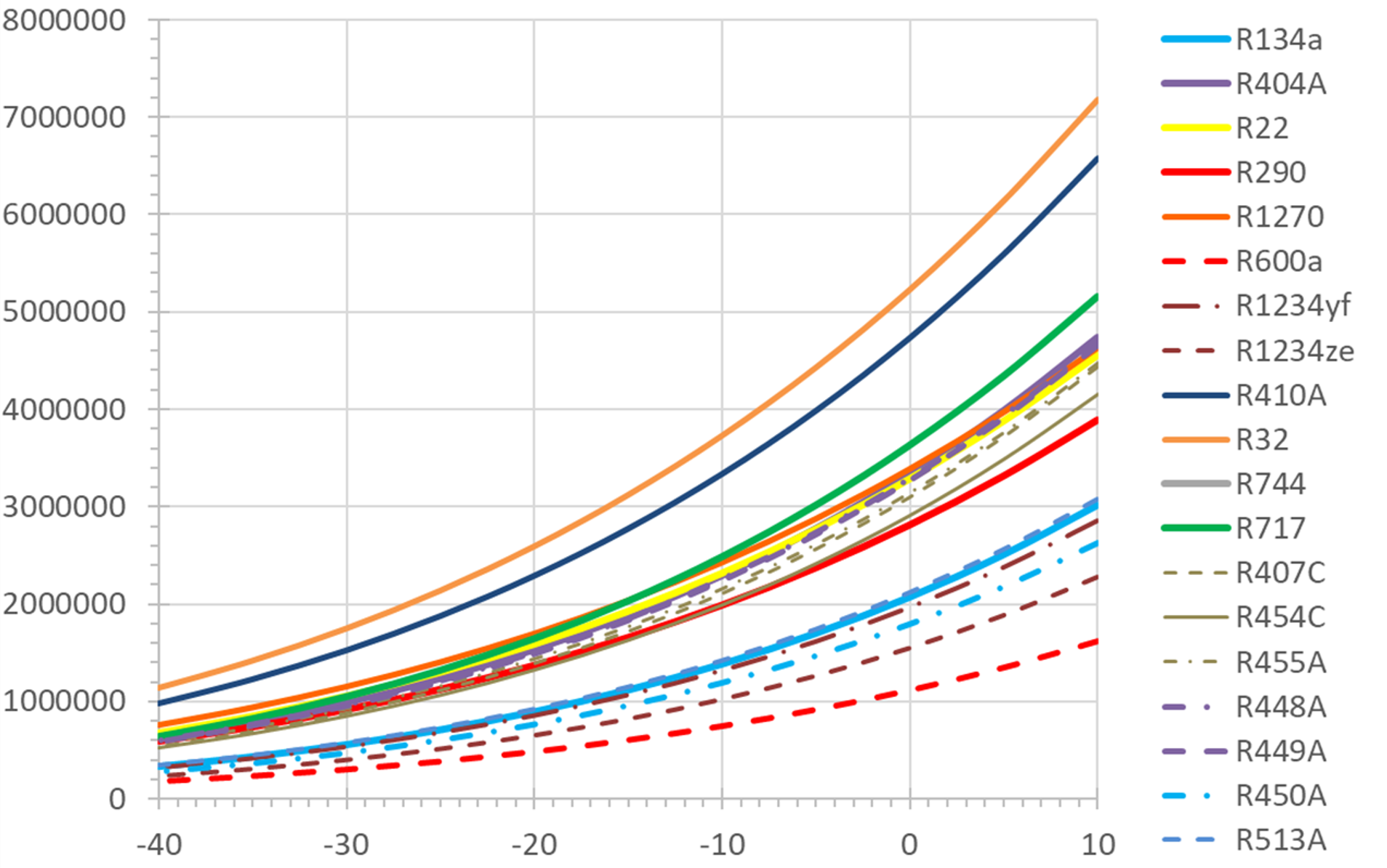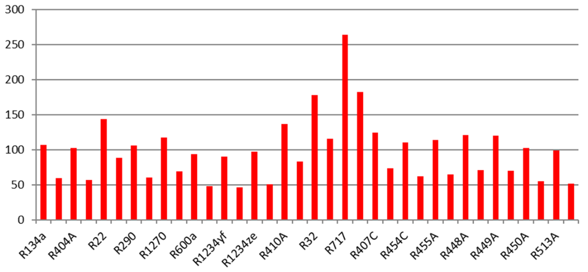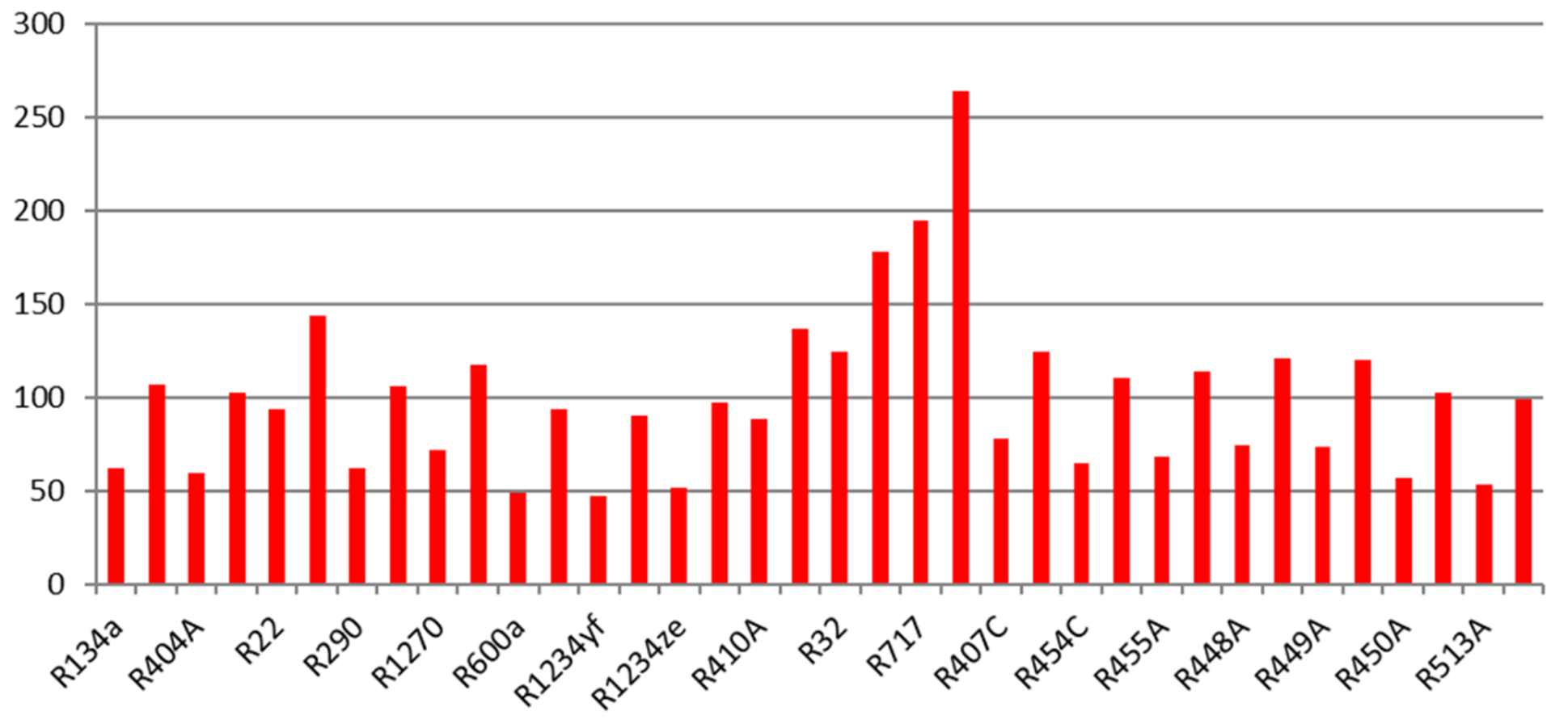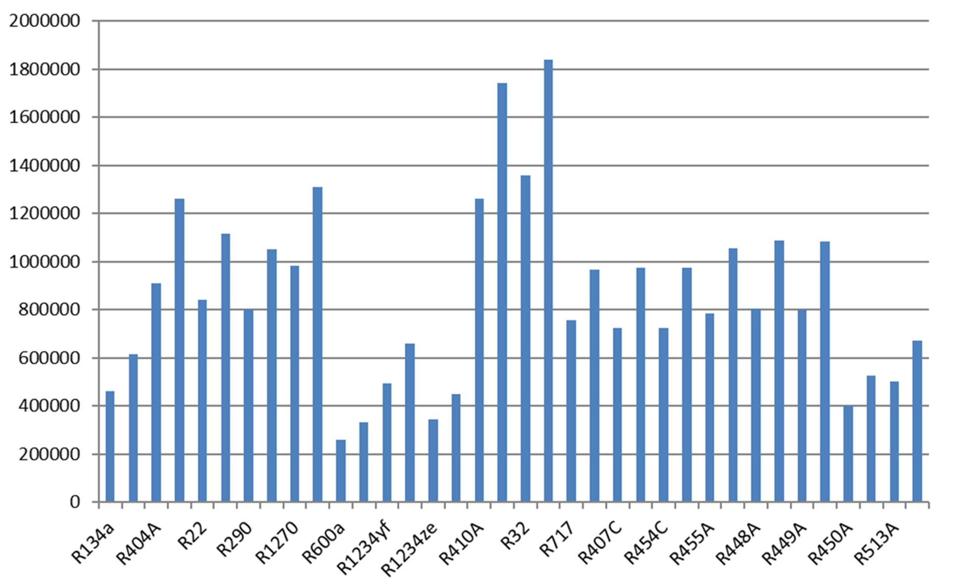 Die volumetrische Kälteleistung unterscheidet sich bei den Kältemitteln stark, von etwa 0,7·106 J/m3 bei R600a bis etwa 3,5·106 J/m3 bei R410A. Bei einer gegebenen Kälteleistung müsste also bei R600a das 5-fache Volumen gefördert werden wie bei R410A.