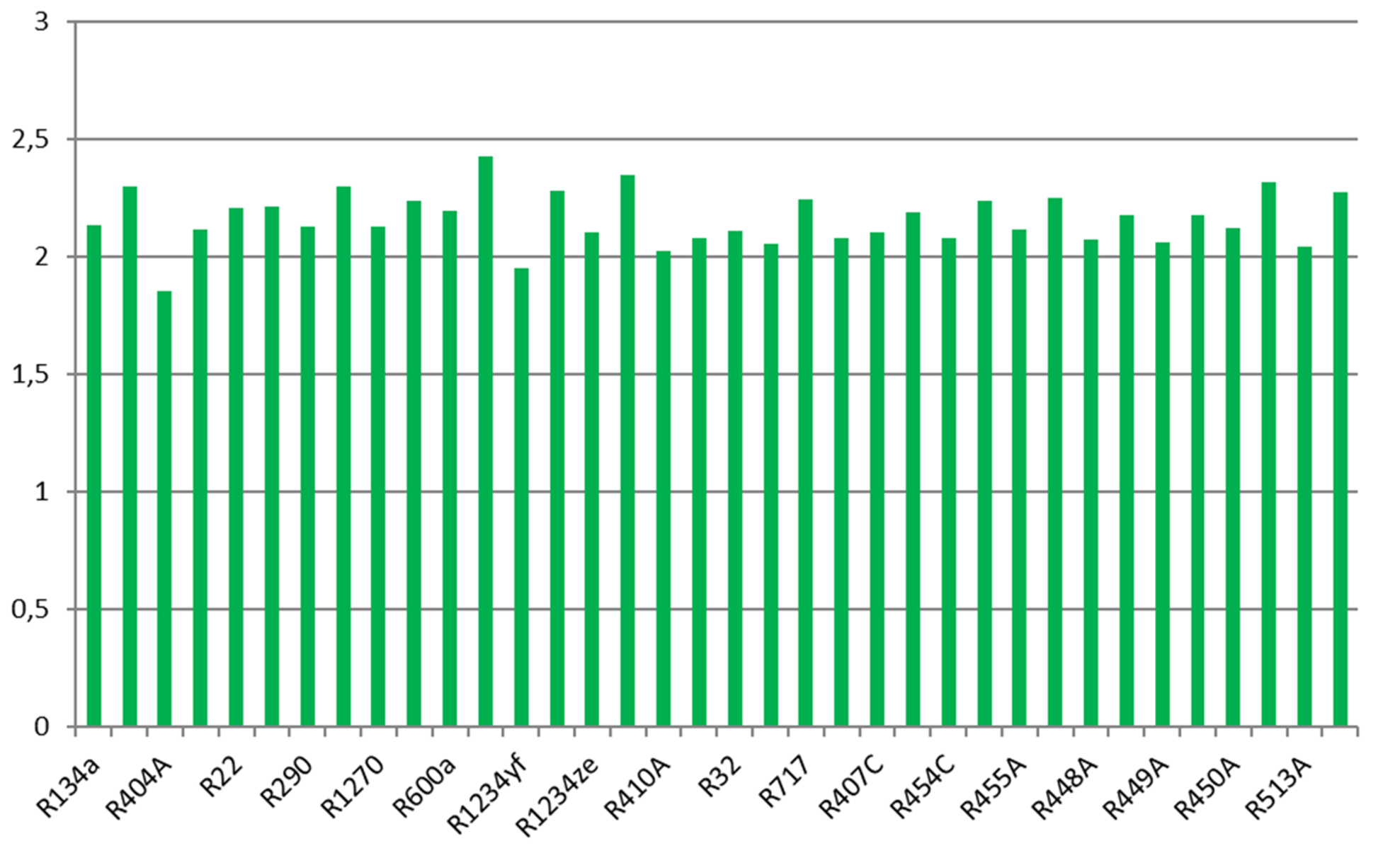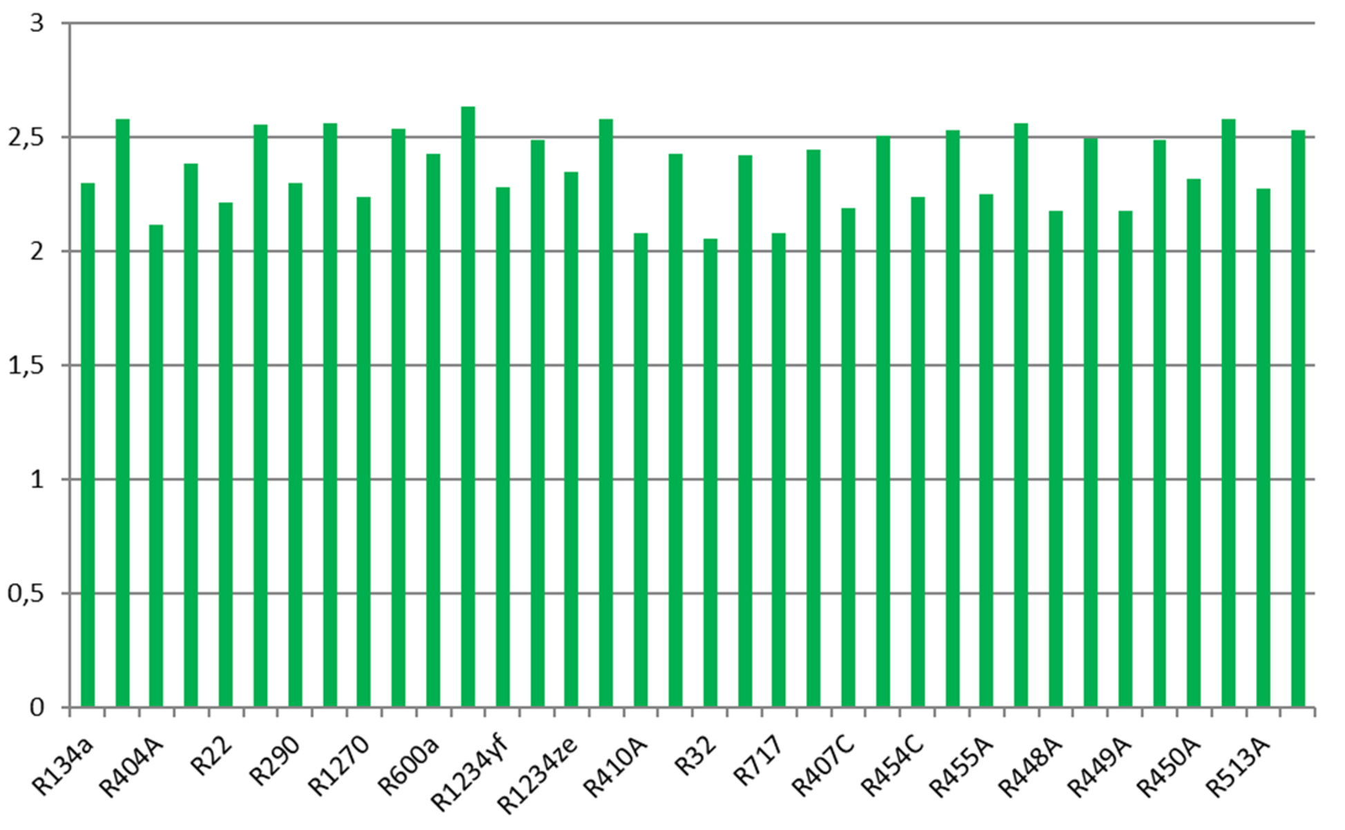 In den Abbildungen sind Berechnungsergebnisse für eine Auswahl an Kältemitteln als Balkendiagramme dargestellt. Dabei sind jedem Kältemittel 2 Balken zugeordnet, links und rechts nebeneinander, für 2 Betriebsbedingungen.