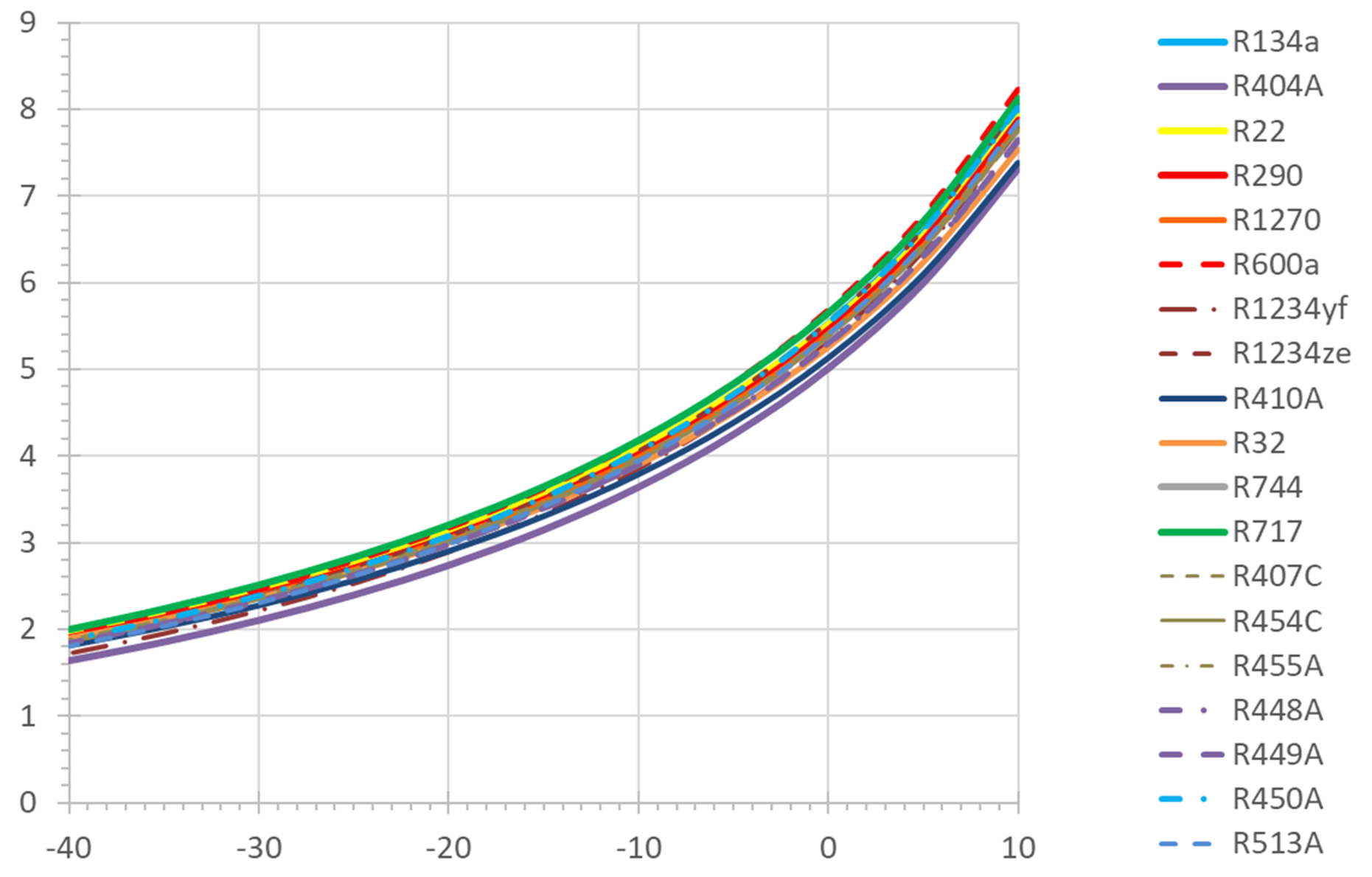 Die Kälteleistungszahl COP zeigt ein ähnliches Bild: Der COP fällt mit steigender Verflüssigungstemperatur. Am stärksten ist die Auswirkung bei R404A, am niedrigsten bei R717. Die meisten anderen Kältemittel verhalten sich zueinander ähnlich.