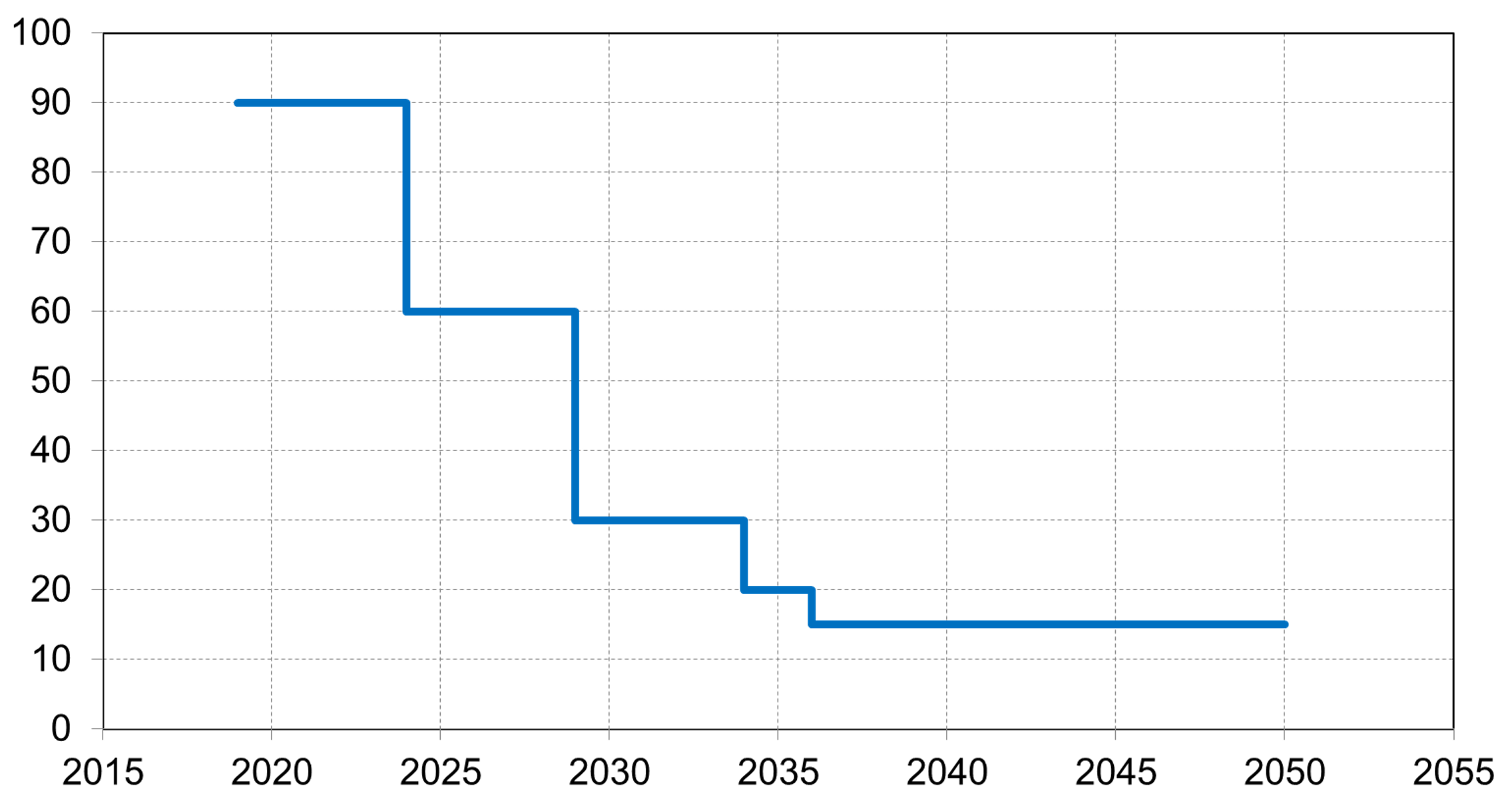 Für Wartung und Nachfüllen von stationären Anlagen und Geräten, die der Staat besitzt oder betreibt, sollen HFKW mit GWP >750, die nicht aus Recycling oder Reclaim stammen, nicht mehr eingesetzt werden.