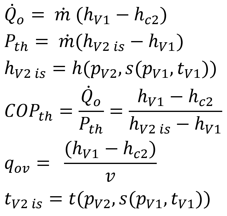 The comparative theoretical evaluation can show better or worse performance of a single refrigerant in the targeted application, compared to a selection of other refrigerants. In the calculation of the theoretical efficiency COPth the massflow falls out, so only refrigerant property data determine the result.