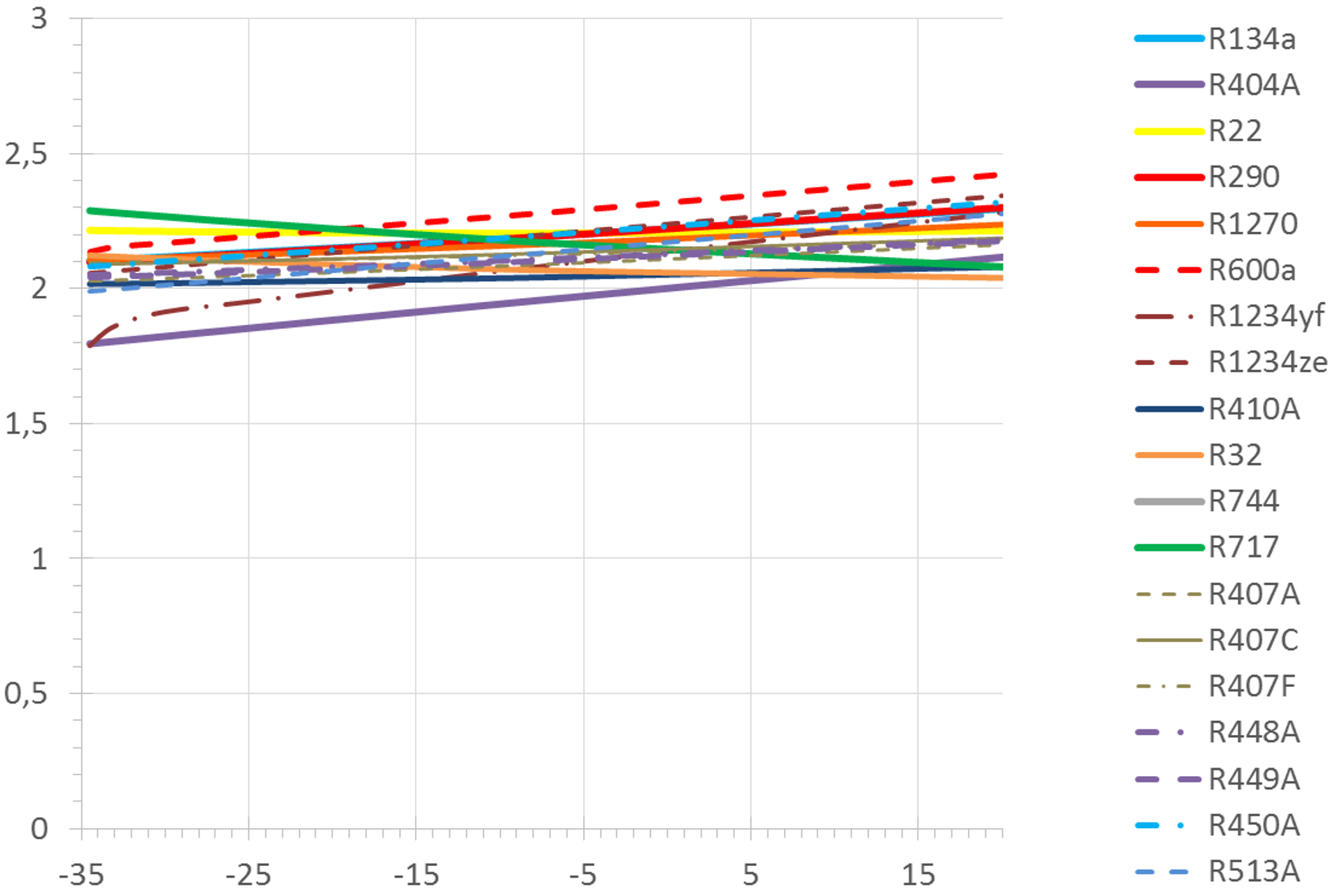 When comparing efficiencies, it is important to respect that different refrigerants might need different system designs for optimum efficiency at given evaporating and condensing temperatures. Many refrigerants, like hydrocarbons and most hydrofluorocarbons, deliver the best COP with an internal liquid to suction line heat exchanger integrated in the system, while this heat exchanger lowers the efficiency for e.g. R717 (ammonia). Thus, it probably makes sense to calculate with different operating conditions and different system designs, before deciding for a refrigerant.