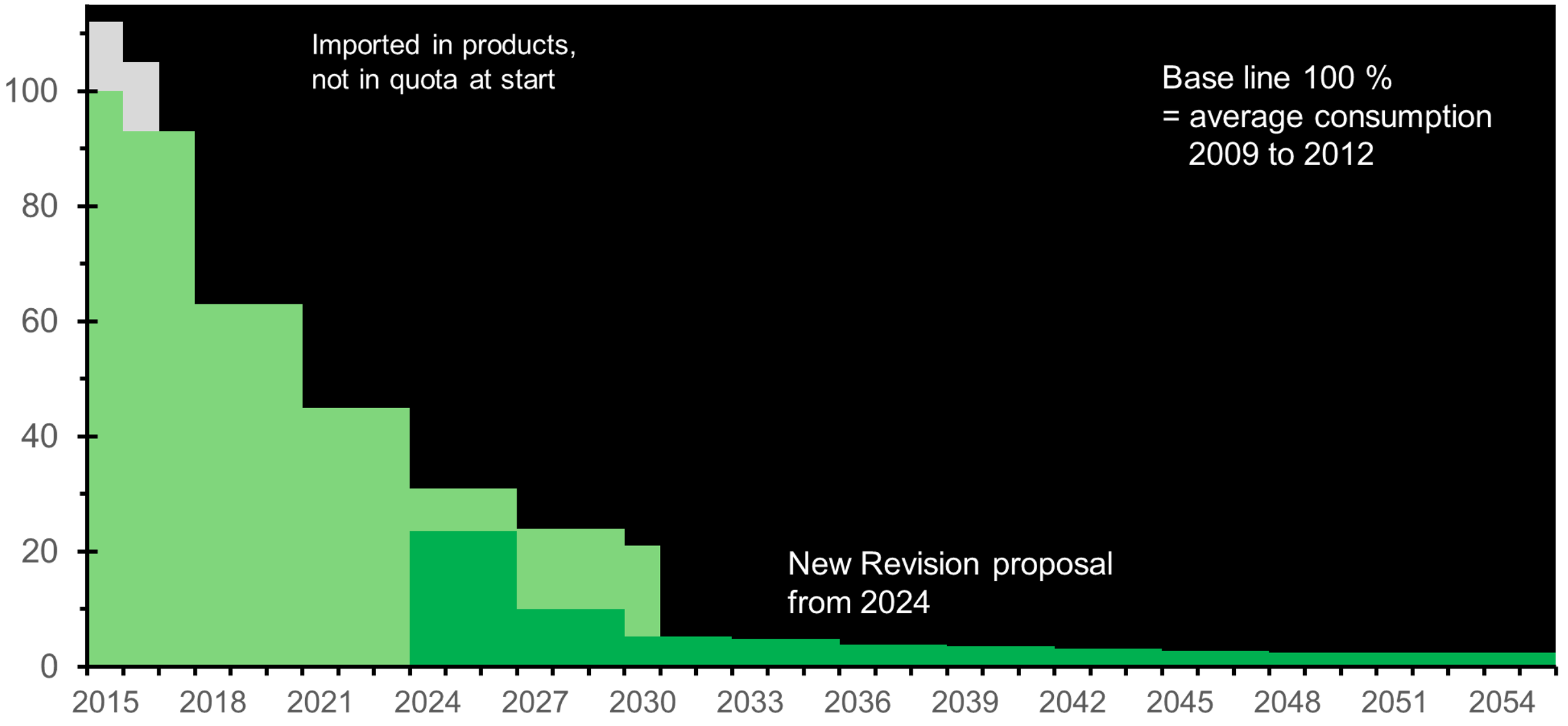 The phase down scenario is adjusted slightly in the single steps from 2025 on compared to the Commission Draft of 2022-04 and has become a phase out scenario for HFC until 2050. In the quota for allowed emissions now also the amount for medical dose inhalers (MDI) of ca 10.5 Mt CO2 equivalent is included. The document lists maximum emission values until 2049 and the value 0 from 2050 onwards. A revision of the scenario is scheduled for 2030.