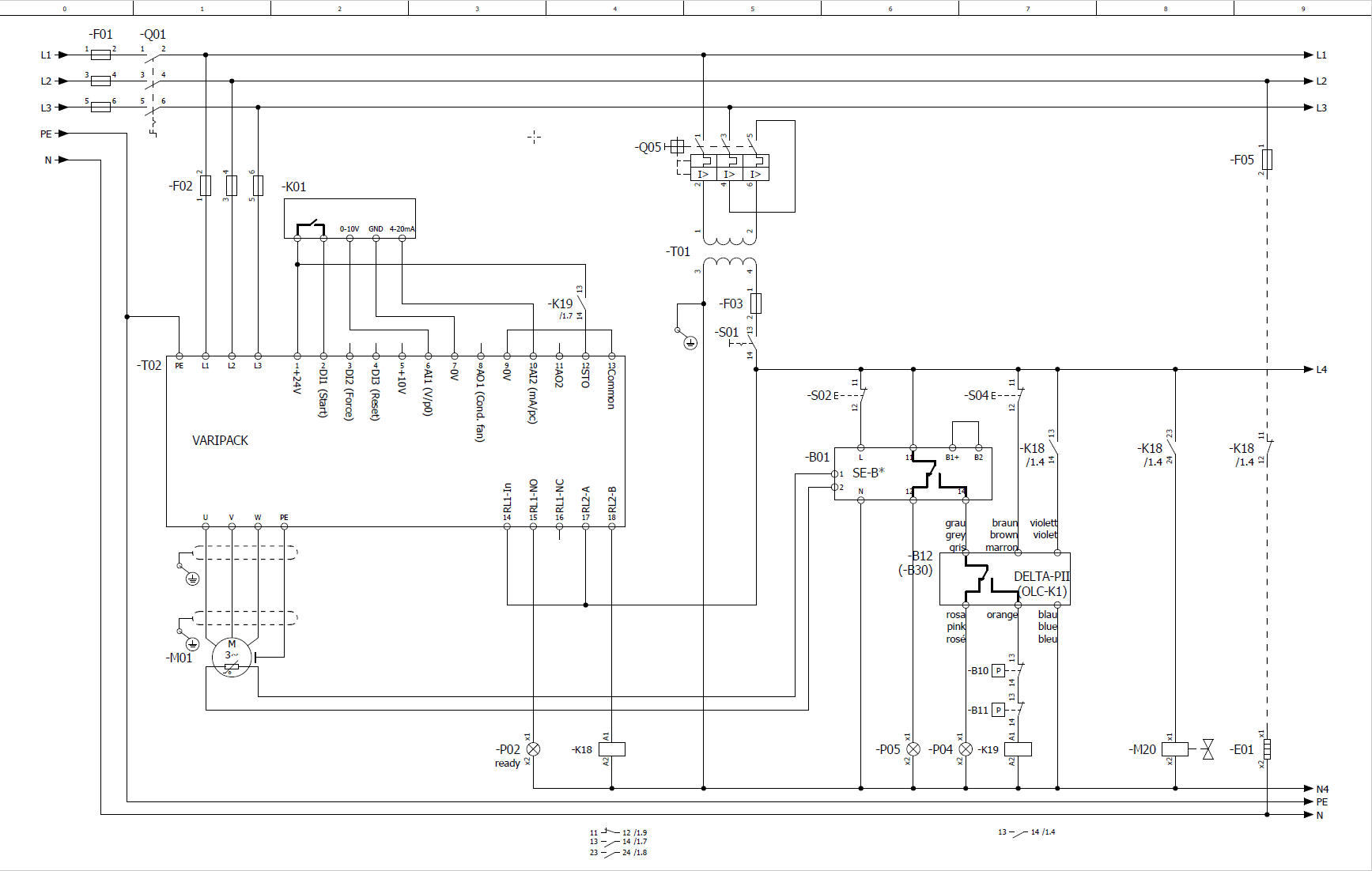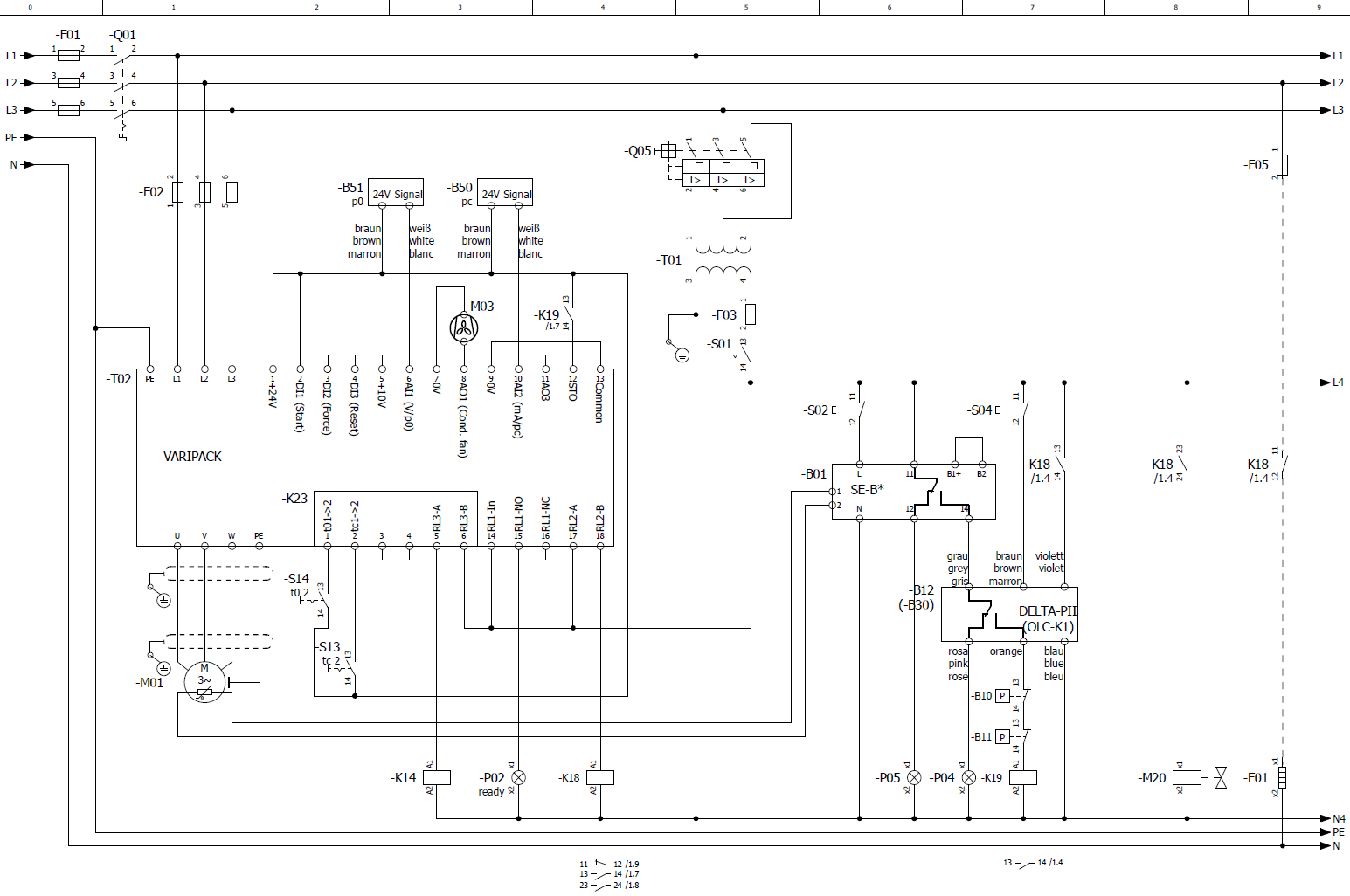 Die Prinzipschaltbilder beinhalten eine optionale Ölüberwachung. Ohne eine solche Überwachung entfällt das Delta-PII bzw. OLC-K1 und die Bauteile S04 und P04. Das Hilfsrelais K19 und die Druckschalter B10 und B11 sollten in diesem Fall in Pfad 7 am Anschluss 14 des B01 (SE-B*) eingebaut werden.