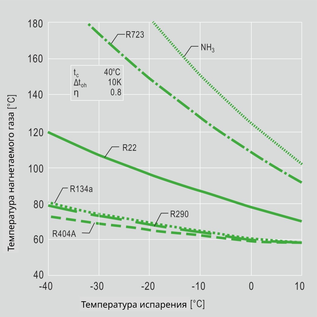 Аммиак имеет преимущественно благоприятные термодинамические характеристики, а аммиачные системы низкое энергопотребление. К недостаткам можно отнести высокие рабочие температуры при сжатии (температура нагнетаемого газа).